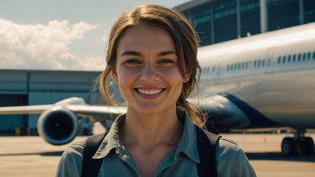 Happy young woman traveling on vacation with airplane boarding alone.
