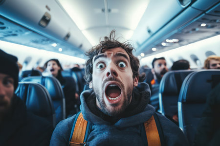 Young man in airplane aisle looks shocked, eyes wide open, expressing fear of flying or dramatic turbulence during flight.