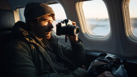 Young woman taking photo of sunrise in airplane window. Travel concept.