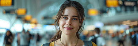 A young woman with a backpack smiles while walking through a busy airport terminal with many travelers