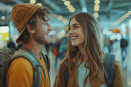 A Caucasian male and female couple carrying backpacks are talking in the airport terminal.