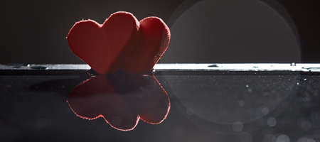 Horizontal shot of silhouettes of two red hearts are reflected in the water on a dark background with a bokeh.