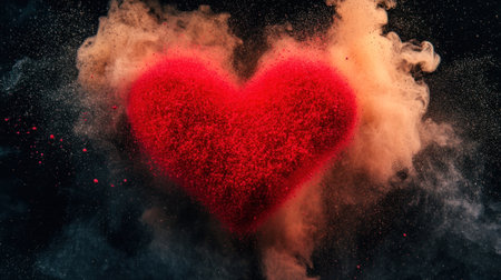 Red heart-shaped particles drifting on a black background, floating in the air, with particles and smoke surrounding the shape of the red heart particles. This scene evokes the concept of Valentine's Day and love, captured in slow motion with a slow shutter speed. The red particles form a glowing heart on the black background, with an explosion of particles and black particles around the heart shape. The image is high resolution, highly detailed, with sharp focus, cinematic lighting, super realistic photography, professional color grading, and soft shadows. --chaos 30 --ar 16:9 --v 6.1 Job ID: 7731bc9d-8417-49b7-8705-34c5b19f3338