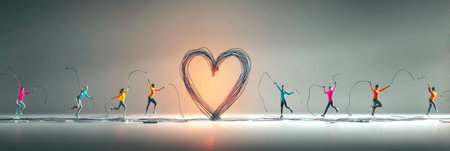 Participants engage in an energetic workout as jump ropes twirl in the air to form a heart shape, showcasing enthusiasm and fitness.