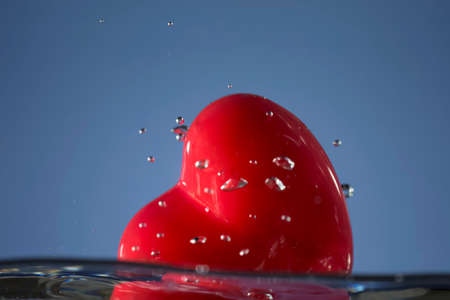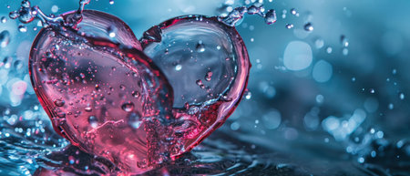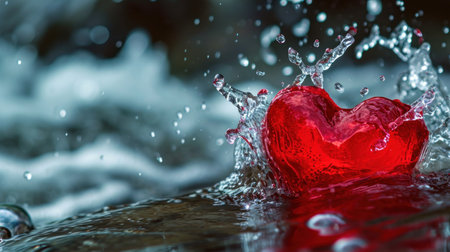 Red heart with drops of water on a background of water splashes