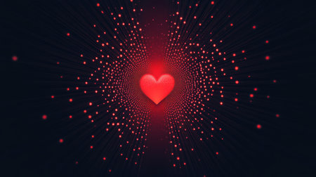 A dark gradient background transitioning from black to red with a glowing central heart.