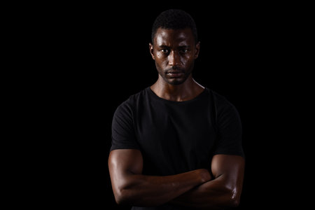 African American man stands confidently against a dark background on black background. His intense gaze and crossed arms suggest determination and strength.