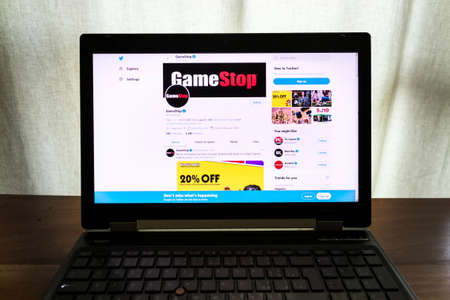 PRAGUE, CZECH REPUBLIC - FEBRUARY 1 2021: GameStop video game corporation and gaming merchandize retailer logo on computer screen on February 1, 2021 in Prague, Czech Republic.