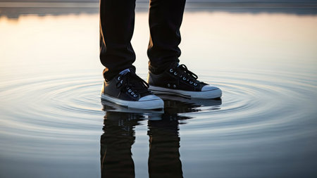 Man in sneakers standing on water surface, closeup of legs.