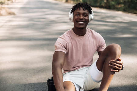 Happy african fitness man sitting relaxed on the road in the park, with a bottle of water after workout, sportsman taking a break after exercise outdoors in nature
