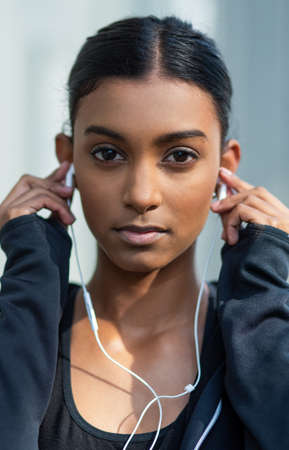 Close up portrait of a young mixed race female athlete wearing wireless headphones and listening to music while standing outside in the city. Determined to get fit and focused on health