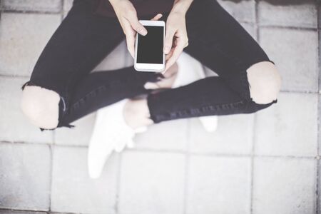 Vertical portrait unrecognizable business woman sitting browsing the internet on a smartphone