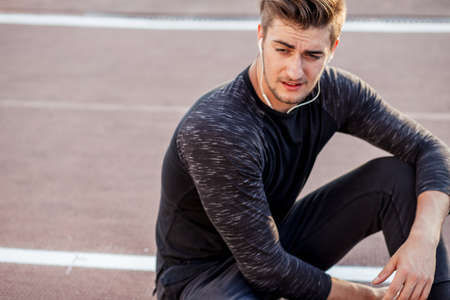 man sitting on race track and rest after jogging