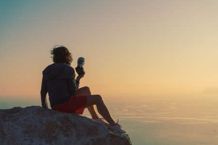 Meditation in the morning in the mountains, girl sitting in lotus position and looking at the sun, back view of man practicing yoga meditation, mountain landscape, morning sun. High quality photo