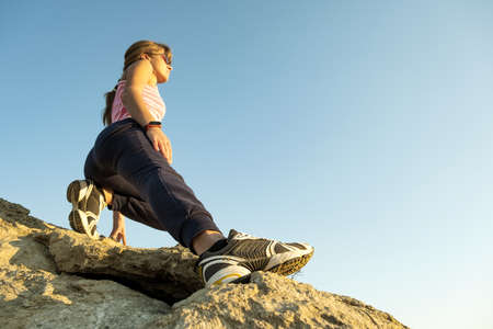 Active lifestyle. Woman climb up on mountain. Rock climbing. Strong and fit athlete. Nature workout. Blue sky