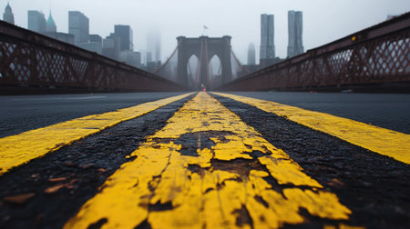 A close-up of worn yellow traffic lines on an old bridge, with a foggy city skyline in the background