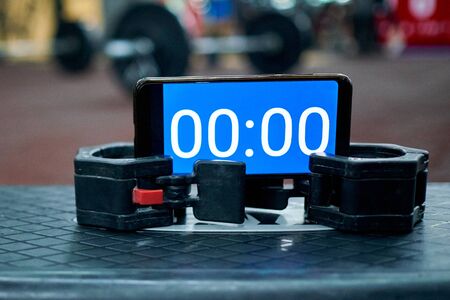 Timer on the stepper platform in the gym before the athlete starts to record video for online qualifier for international crossfit competition.