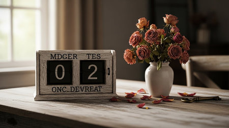 A minimalist wooden flip calendar, displaying '02', is set on a rustic wooden table. A bouquet of peach-toned roses in a simple white ceramic vase sits nearby, with scattered rose petals on the table surface. A vintage brass key lies to the side, adding a touch of mystery or history. The scene is lit by soft, natural light, creating a calm and understated aesthetic.