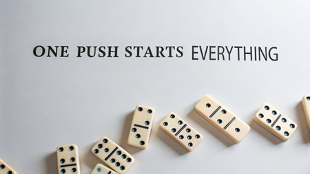 Several ivory-colored dominoes are arranged on a clean white surface, showcasing the beginning of a chain reaction, perfect for illustrating the concept of cause and effect.