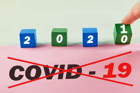 The hand turns the cube and changes the year 2020 from Covid-19 to 2021 without coronavirus.