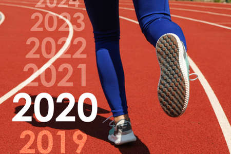 girl in sports uniform running around. Healthy way of life, an infused figure. sneakers close-up, finish 20189 Start to new year 2020, plans, goals, objectives.