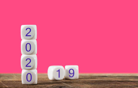 Two wooden blocks with numbers 2019 and 2020. The concept of the beginning of the new year. New objectives. Next decade. Trends and changes in the world. Build plans and goals. Time report