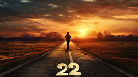 A person in jeans and shoes walking on asphalt road from 2019 into New Year 2020. Concept of new beginning and directions, or stepping into a new year ahead.