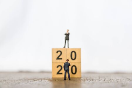 2020 new year and Business Planning concept. Close up of two businessman miniature figure standing in front of stack of wood number blocks on wooden table and white background.