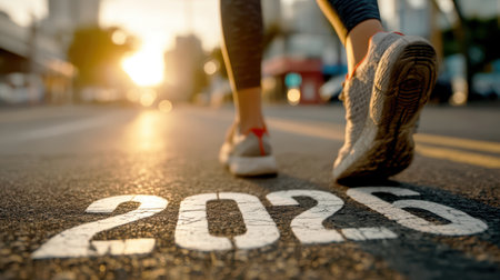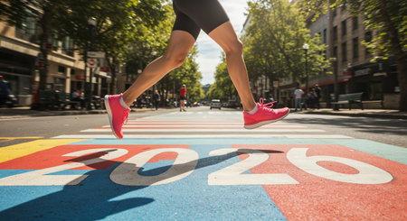Low-angle view of an individual's legs actively moving over a colorful urban crosswalk with the prominent white number 2026 painted on its surface.