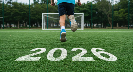 A low-angle view from behind shows a child's legs in motion on a vibrant green sports field, with the year 2026 marked clearly on the grass toward a goal.