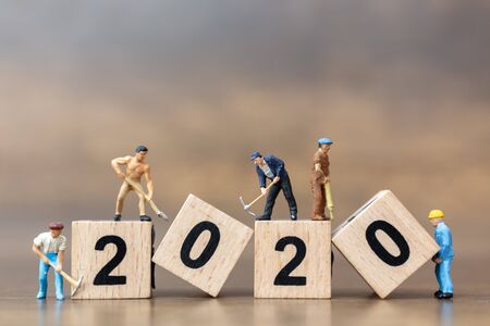 Miniature people : Worker team create wooden block number 2020 , Happy new year concept