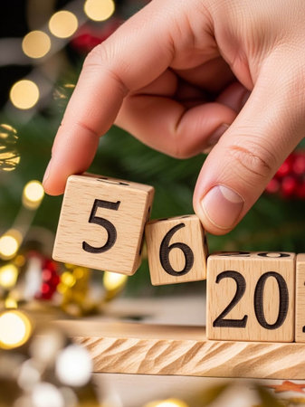 Hand holding wooden cubes with numbers on background of Christmas tree.