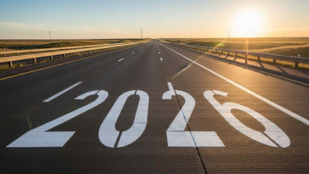An astronaut walks alone on a deserted road under a vibrant sunrise, symbolizing a new beginning for 2026, filled with exploration and possibilities.