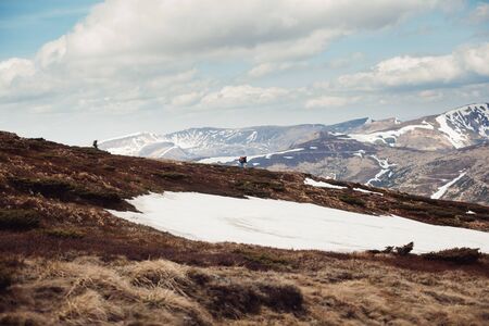 A route through mountain peaks and hills through majestic landscapes with horses in the distance. Active tourists, hiking, Caucasus Mountains Oshten Fisht. Sport lifestyle concept
