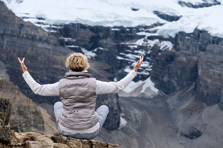 Meditation in mountains. Woman meditating on rock in front of pear with glaciers and snow. Fairview Mountain top in Lake Louise area. Banff National Park. Alberta. Canada.