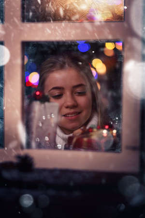 happy young girl looks out the window in winter Christmas evening