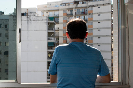 middle-aged man leaning on the window looking at the horizon from the back