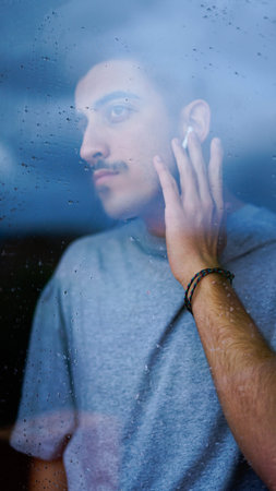 Blurred viewpoint. Closeup of a thoughtful young man seen through a window.