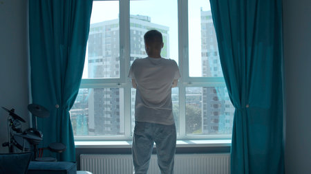 Rear view of a pensive man standing at home by the window and looking at the city. Media. Man in home clothes spending time in reflection in his bedroom.