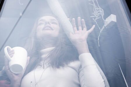 selective focus of beautiful woman holding cup of coffee in cafe behind window