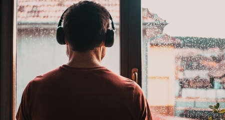 Sad man with depression looking through a window during rainy weather