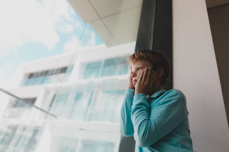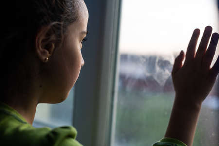 Sad children are looking out the window. Time of the pandemic.