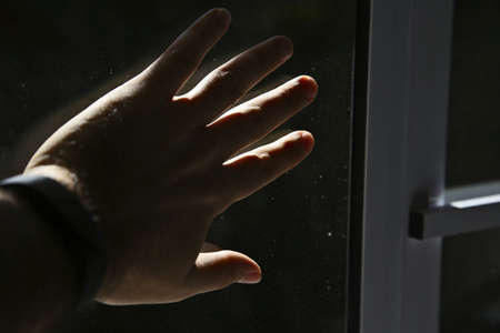 Coronavirus (covid-19) self quarantine or social distancing concept image consisting person touching a window.