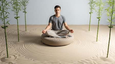 Man meditating in a peaceful setting with bamboo plants and sand.