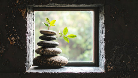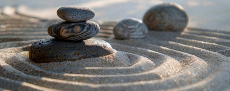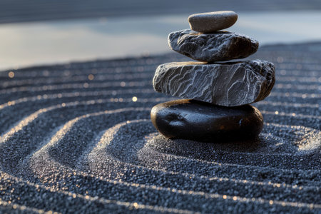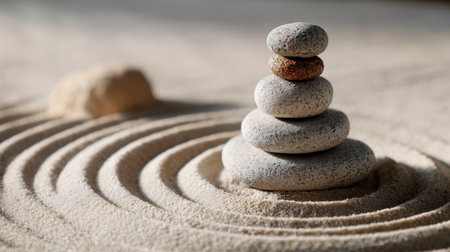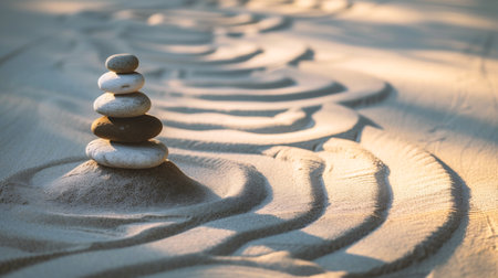A serene scene of stacked stones in a zen garden, surrounded by raked sand patterns, creating a peaceful atmosphere ideal for meditation and relaxation.