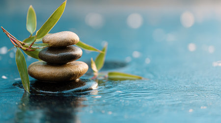 A close-up captures stacked stones with bamboo elements set against a blurred water background. The composition uses soft lighting and a shallow depth of field to highlight the texture of the stones and the delicate bamboo leaves. The image's serene aesthetic lends itself well to various commercial and editorial applications.