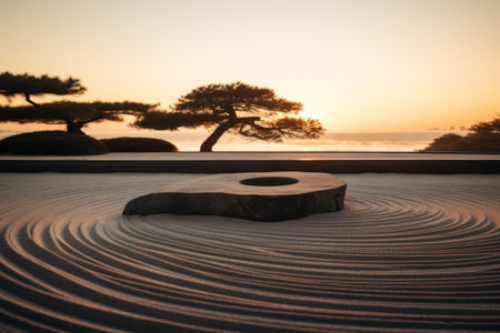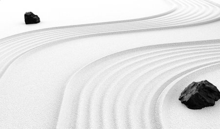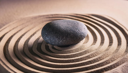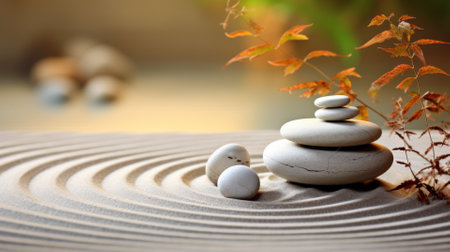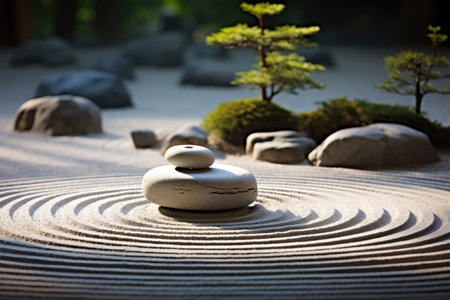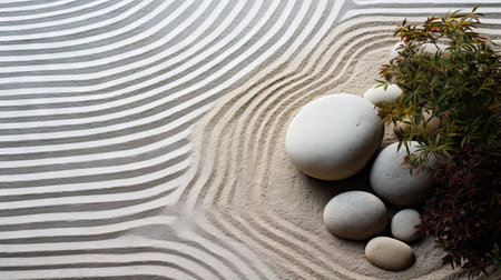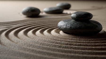 Zen garden with smooth stones and raked sand, tranquility