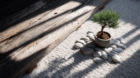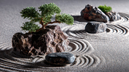This serene zen garden scene features a miniature tree atop rocks surrounded by softly raked sand, inviting mindfulness, peace, and relaxation in any environment.