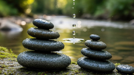 Two stacks of dark, smooth stones are presented outdoors, with water droplets falling into a tranquil pool. The natural lighting and soft focus create a peaceful ambiance, enhanced by the surrounding greenery. This image is suitable for various commercial uses, including wellness, relaxation, and nature-related content.