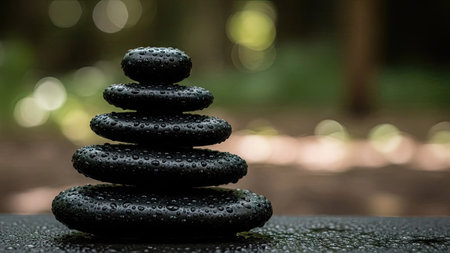 Stack of black zen stones with water drops on green background.